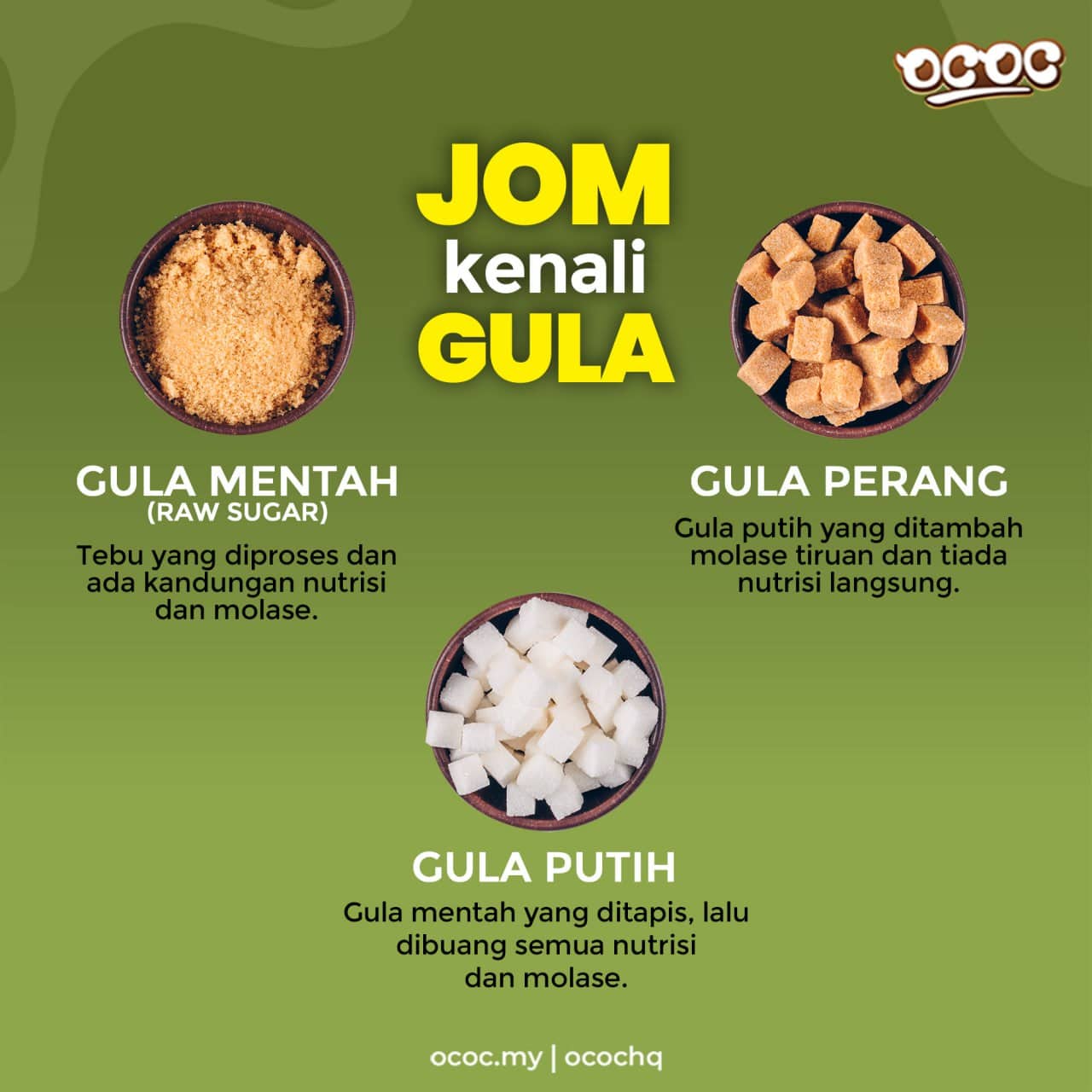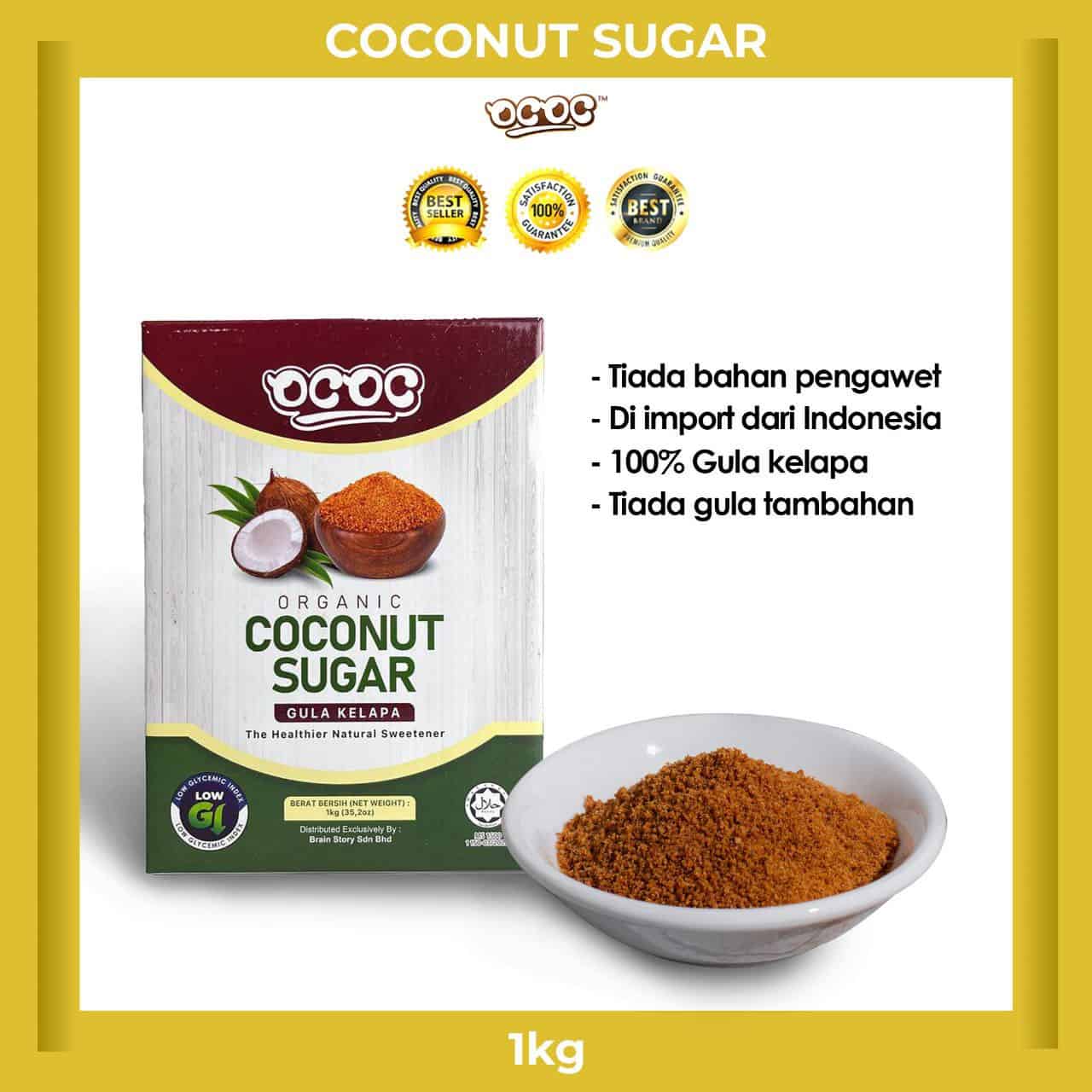 Gula Kelapa OCOC ialah pemanis semulajadi yang berasakan tumbuhan. Ianya alternatif kepada gula putih yang menjadi punca kepada banyak penyakit. Gula kelapa OCOC telah dinobatkan sebagai Pemenang Readers’ Choice 2020 dan 2021 untuk kategori Best Organic Product For Mothers. Gula kelapa OCOC ada nilai glisemik yang lebih rendah berbanding gula putih dan sesuai untuk diet harian. Ianya bebas dari pewarna tiruan, perasa sintetik, bahan pengawet dan bahan kimia.