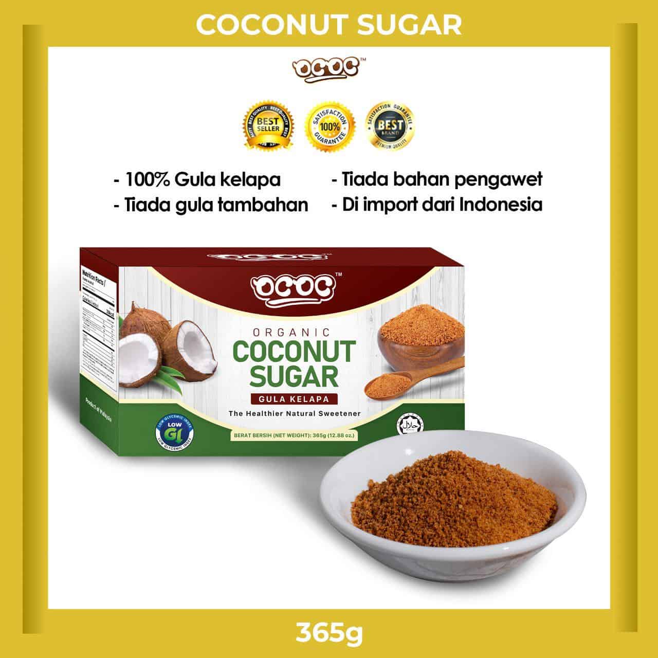 Gula Kelapa OCOC ialah pemanis semulajadi yang berasakan tumbuhan. Ianya alternatif kepada gula putih yang menjadi punca kepada banyak penyakit. Gula kelapa OCOC telah dinobatkan sebagai Pemenang Readers’ Choice 2020 dan 2021 untuk kategori Best Organic Product For Mothers. Gula kelapa OCOC ada nilai glisemik yang lebih rendah berbanding gula putih dan sesuai untuk diet harian. Ianya bebas dari pewarna tiruan, perasa sintetik, bahan pengawet dan bahan kimia.