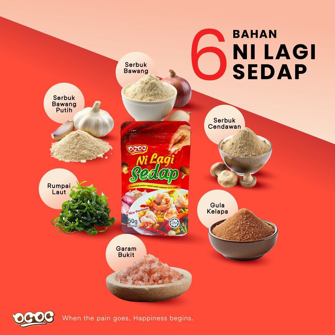 Ni Lagi Sedap ialah serbuk perasa semula jadi yang diperbuat daripada bahan kualiti tinggi. Diformulasi dengan rumpai laut, cendawan dan bawang putih yang kaya dengan rasa umami. Gula kelapa organik OCOC pula sebagai pemanis semula jadi. Setiap bahan dipilih untuk hasilkan rasa yang lembut dan cukup sedap tanpa rasa berlebihan. Produk ini bebas perasa dan pewarna tiruan. Sesuai untuk mereka yang utamakan kesihatan dan kualiti dalam masakan harian. Satu produk dengan pelbagai kegunaan, buat setiap suapan lebih sempurna.
